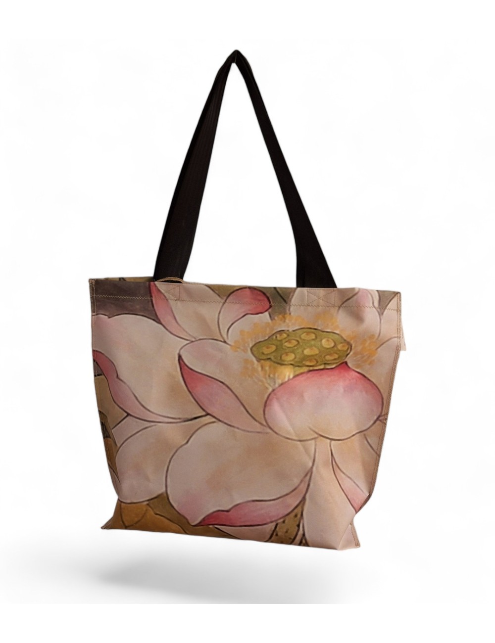 Χειροποίητες τσάντες από μουσαμά. Δημιουργίες προσφύγων που διαβιούν στην Ελλάδα σε συνεργασία με τη μη κερδοσκοπική εταιρεία ΙΝΣΤΙΤΟΥΤΟ ΟΜΑΔΑ ΓΙΑ ΤΟΝ ΚΟΣΜΟ.