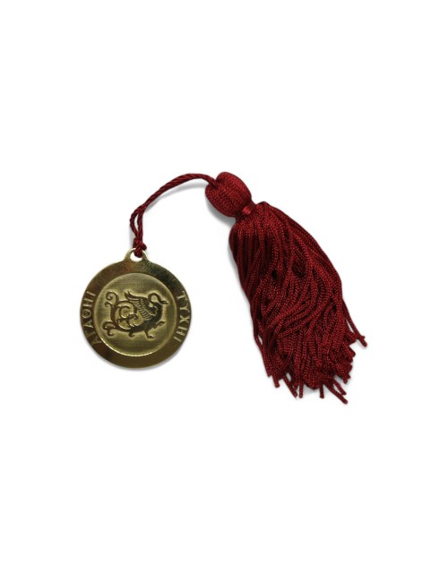 Μενταγιόν που φέρει το σήμα του Μουσείου Ηρακλειδών και το μονόγραμμά του.